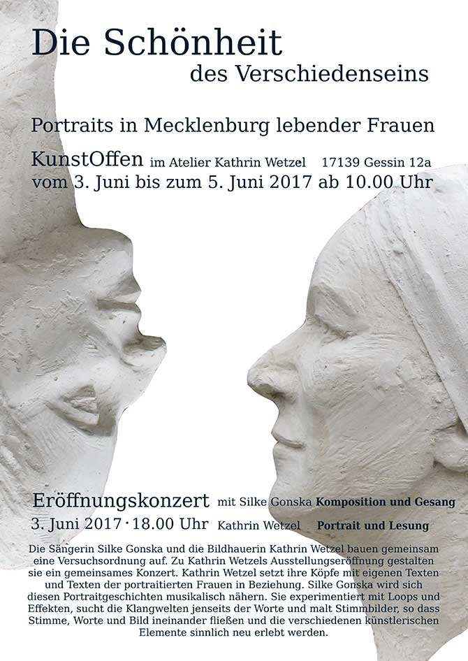 ![]() ![]() ![]() ![]() KunstOffen vom 3. - 5. Juni 2017 im Atelier Kathrin Wetzel in Gessin Die Sängerin Silke Gonska und die Bildhauerin Kathrin Wetzel aus dem benachbarten Gessin bauen gemeinsam eine Versuchsordnung auf. Zu Kathrin Wetzels Ausstellungseröffnung am 3. Juni 2017 um 18.00 Uhr gestalten sie ein gemeinsames Konzert. Kathrin Wetzel setzt ihre Köpfe mit eigenen Texten und Texten der portraitierten Frauen in Beziehung. Silke Gonska wird sich diesen Portraitgeschichten musikalisch nähern. Sie experimentiert mit Loops und Effekten, sucht die Klangwelten jenseits der Worte und malt Stimmbilder, so dass Stimme, Worte und Bild ineinander fließen und die verschiedenen künstlerischen Elemente sinnlich neu erlebt werden. Weitere Informationen finden Sie HIER Kunst Offen vom 14. - 16. Mai 2016 in Gessin Kathrin Wetzel betreibt auf ihrem Hof, im idyllischen Dorf Gessin, zwischen Basedow und Gielow gelegen, ihre eigene Bildhauerei. Ihr Atelier steht auch in diesem Jahr wieder der Öffentlichkeit zur Verfügung. Atelier, Werkstatt, Ausstellung - Bildhauerei und Malerei/Zeichnungen. Führungen, Gespräche in gemütlicher Runde, direkte Arbeiten an Figuren. Samstag, 15. Mai 2016, 19.oo Uhr: Konzert in Atelier mit Silke Gonska (www.silke-gonska.de) "Silke Gonska ... vom januardüsteren "Blues And Trouble" über Frühlings-, Sommer- und Herbstlieder bis zum vielstimmig-optimistischen Fazit "I Am Happy" ... Instrument ist ihre Stimme ... (sie) malt Stimmbilder und lässt die Töne im Raum tanzen." "KUNST OFFEN" in Gessin 14. - 16. Mai 2016 / Öffnungszeiten: Sa & So: 10-20 Uhr, Mo 10-15 Uhr ![]() Kunst auf der Wasserburg Liepen Zwei regionale Künstlerinnen, Marion Gesell und Kathrin Wetzel, stellen am 25. April um 17 Uhr einen Teil ihrer Werke auf der Wasserburg Liepen aus. Der Großteil der Werke wird danach noch eine Woche lang täglich zwischen 15 Uhr und 17 Uhr aus der Wasserburg zu besichtigen sein. In ihren "Bildnerischen Etüden" stellt die Bildhauerin Kathrin Wetzel aus dem benachbarten Gessin, die an der Rostocker Technischen Kunstschule bei Bildhauer Thomas Jastram studiert hat, ihre Zeichnungen, Plastiken und Portraits aus. Weiter Informationen: www.alte-pommeranze.de Artikel aus dem NORDKURIER vom 22. November 2014 ![]() Kunstvoll auch zur letzten Ruhe Ganz kühl und schnörkellos zum letzten Gang. Der Pragmatismus bestimmt immer stärker die Bestattungskultur. Die Künstlerin Kathrin Wetzel aus Gessin hält gegen diesen Trend. Sie gestaltet Urnen nach Wunsch ganz individuell eben als Kunstwerke. Von Eberhard Rogmann GESSIN. Im Atelier von Kathrin Wetzel steht eine Kleinplastik, die unter den größeren weißen Gipsskulpturen auffällt. Eine schlanke Frauengestalt. Sie steht auf einem Sockel, den noch weitere Frauenbildnisse zieren. Der trägt eine Inschrift in Deutsch und Altgriechisch: "Darum wachet, denn ihr wisset weder Tag noch Stunde." "Es ist ein Zitat aus dem biblischen Gleichnis von den klugen und törichten Jungfrauen. Das gefällt mir. Es ist so zutreffend", sagt die Künstlerin. Dabei lüftet sie das Geheimnis des Kunstwerkes. "Es ist eine Urne." Genauer gesagt ist es ein Gipsmodell. Denn die eigentliche Urne ist als Bronzeguss geplant. So wie der kleine Hirte, der hinterm Haus im Garten steht. Was veranlasst sie zu diesen außergewöhnlichen Kreationen? "Das Thema Tod und Sterben hat mich schon als Jugendliche stark beschäftigt. Bleiben wir in der Zeit, wenn wir tot sind?", beschreibt sie ihren Weg zur Urnen-Schöpferin. Die heutige Einstellung der Gesellschaft zum Thema Tod sei sehr sachlich geprägt. "Doch auf diesem Weg findet man kaum Antworten", sagt Kathrin Wetzel. Für ihre Werke ließ sie sich inspirieren von der antiken Bestattungskultur der Römer und Etrusker. Die Menschen damals hatten offenkundig eine ganz andere Beziehung zum Tod und der Zeit danach gehabt. Sie haben diesem Teil des Daseins viel mehr Aufmerksamkeit gewidmet und Vorsorge getroffen. Ihre Grabmale geben davon beredtes Zeugnis, weiß sie seit ausführlichen, Besuchen in Berliner Museen. Die Kunst erscheint Kathrin Wetzel als das geeignete Medium, sich mit den angestauten Fragen zum Leben danach auseinanderzusetzen. Auf die Gestaltung der individuellen Urnen kam sie aus zwei Beweggründen. Zum einen ist die Bestattungskultur hierzulande stark im Umbruch. Die über Jahrhunderte praktizierte Erdbestattung nach christlichem Ritus wird inzwischen immer seltener. Viele Leute suchen nach Alternativen - und finden sie. Allerdings gelten in Deutschland immer noch strikte Vorschriften für Beisetzungen. So ist es nicht gestattet, die Asche eines Verstorbenen beispielsweise Zuhause aufzubewahren, wie es beispielsweise in vielen fernöstlichen Ländern üblich ist. Der zweite Grund für ihre Arbeit zum Thema Tod ist dann auch wieder pragmatisch Natur: Sie hat das künstlerische Handwerk zum Fertigen der Urnen schließlich erlernt. Nach einem Studium bei dem Bildhauer Thomas Jastram fühlte sie sich gerüstet für diese Herausforderung. Jetzt, so bekennt sie, stecke sie voller Ideen. "Mir schwebt vor, eine Urne zu gestalten mit einer liegenden Frau", verrät die Künstlerin. Zu weiteren Bekenntnissen kommt sie nicht. Eine Kinderschar fällt in ihr Atelier ein und beansprucht die Mutter für sich. "So ist das im Leben. Das gehört eben alles zueinander", lautet ihr Kommentar, während sie sich den Kleinen zuwendet. Kunst Offen vom 07. - 09. Juni 2014 in Gessin ![]() 1994 wurde die aus Schweden stammende Veranstaltung KUNST OFFEN zum ersten Mal vom Tourismusverband im M-V organisiert. 20 Jahre sind seit dem vergangen und haben aus diesem anfänglichen Projekt die größte Kunst- und Kulturveranstaltung im Lande gemacht. Unser Dorf Gessin ist nicht das erste Mal dabei. In diesem Jahr wird es sehr "fraulich". Drei Künstlerinnen, die mit Gessin in einer engen Beziehung stehen, stellen in diesem Jahr gleich an 4 Orten im Dorf aus. Dorfkapelle, - laden und - haus sowie die Bildhauerei laden dazu ein. K